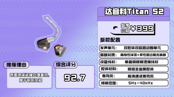 线材方面,Titan S2 使用四股单晶铜与单晶铜镀银混编线,内部加入高性能 hifi 解码耳放芯片,输出干净而稳定。麦克风属于实用向类型,日常通话没有问题,不过在人声拥挤或道路噪音大的环境下,拾音表现会有一定下降。整体功能上偏实在、不花哨,适合喜欢均衡、柔和、长时间耐听风格的用户选择。