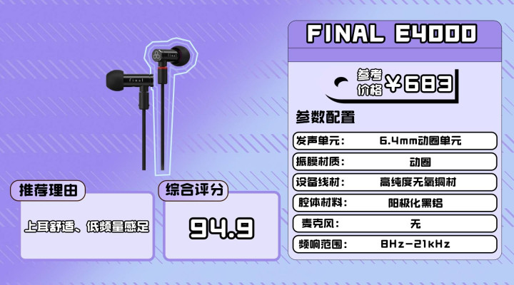 配置方面使用高纯度无氧铜线材,耐用度较高,也能带来更稳定的传导效果。MMCX 可换线接口方便后期升级线材或更换风格。需要注意的是E4000不带麦克风,整体更适合作为“纯听音乐”的随身耳机。