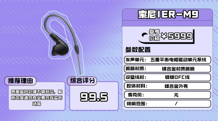 IER-M9耳挂与混合硅胶耳塞、三重舒适耳塞搭配后,初次佩戴的贴合度不错,但耳挂材质时间长了容易变粘,影响触感;连接处虽然是常规设计,但在频繁活动时,偶尔会出现接触点不稳带来的轻微杂音,这对专业用途来说需要留意。采用五单元平衡电枢架构,走的是典型监听风格。整体偏中性,没有明显染色,人声线条清晰,定位精确,细节表现直接,不做修饰。声底干净,对于喜欢浓郁低频或追求沉浸感的玩家,IER-M9 的这种务实监听味可能会显得偏寡淡。高频延伸自然,整体偏稳,更契合舞台、器乐解析或录音监听环境。