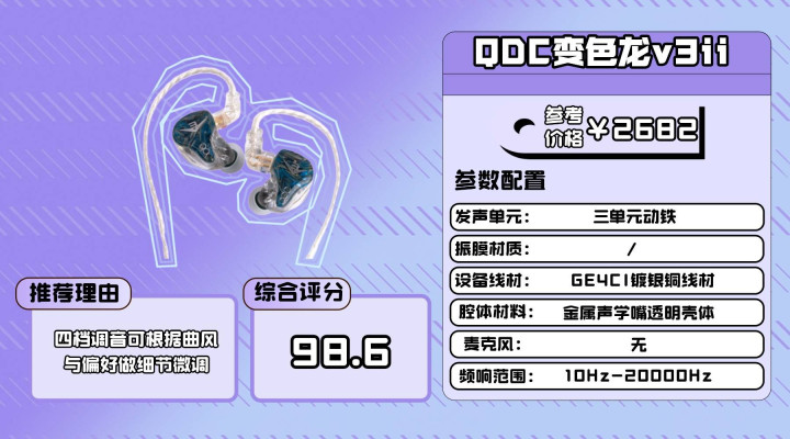 Q D C 变色龙 V3II 提供公模与定制两类版本,我手上的是公模款。外观采用透明腔体与 GE4CI 镀银铜线的组合,再加上金属声学嘴,整体视觉效果十分精致,佩戴方面贴耳度和隔音表现都保持着不错的稳定性。三单元动铁架构是 V3II 的基础配置,声场开阔感在同类价位中比较吃香,结像边缘清楚。不过中频厚度不算强,人声密度显得稍薄一些,器乐线条不够圆润,是偏清爽的听感。如果希望声音更耐听或者更饱满一些,可以通过橡胶套或前端来弥补中频凝聚力;反而升级线材带来的提升相对有限。