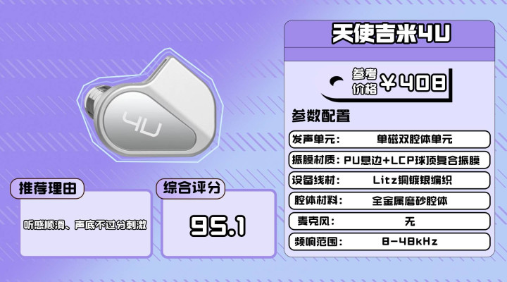 4U使用单磁双腔体单元,PU悬边与LCP球顶振膜的组合使整体声音走向偏稳,解析在线,但不会出现一些动铁耳机会有的第一耳抓耳感。高频亮度正常,延展性属于常规水准,适合不喜欢过亮声底的用户。对前端没有太苛刻要求。腔体为金属磨砂材质,虽然比树脂略重,但体积做得足够小,前腔入耳耦合结构能明显提高贴合度,配合绕耳方式,稳定性表现不错。